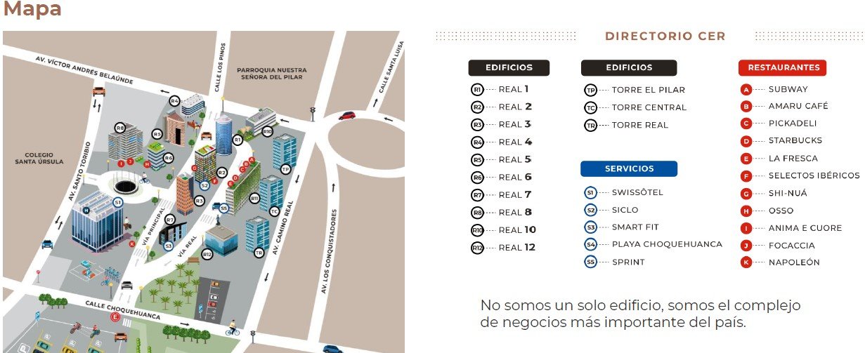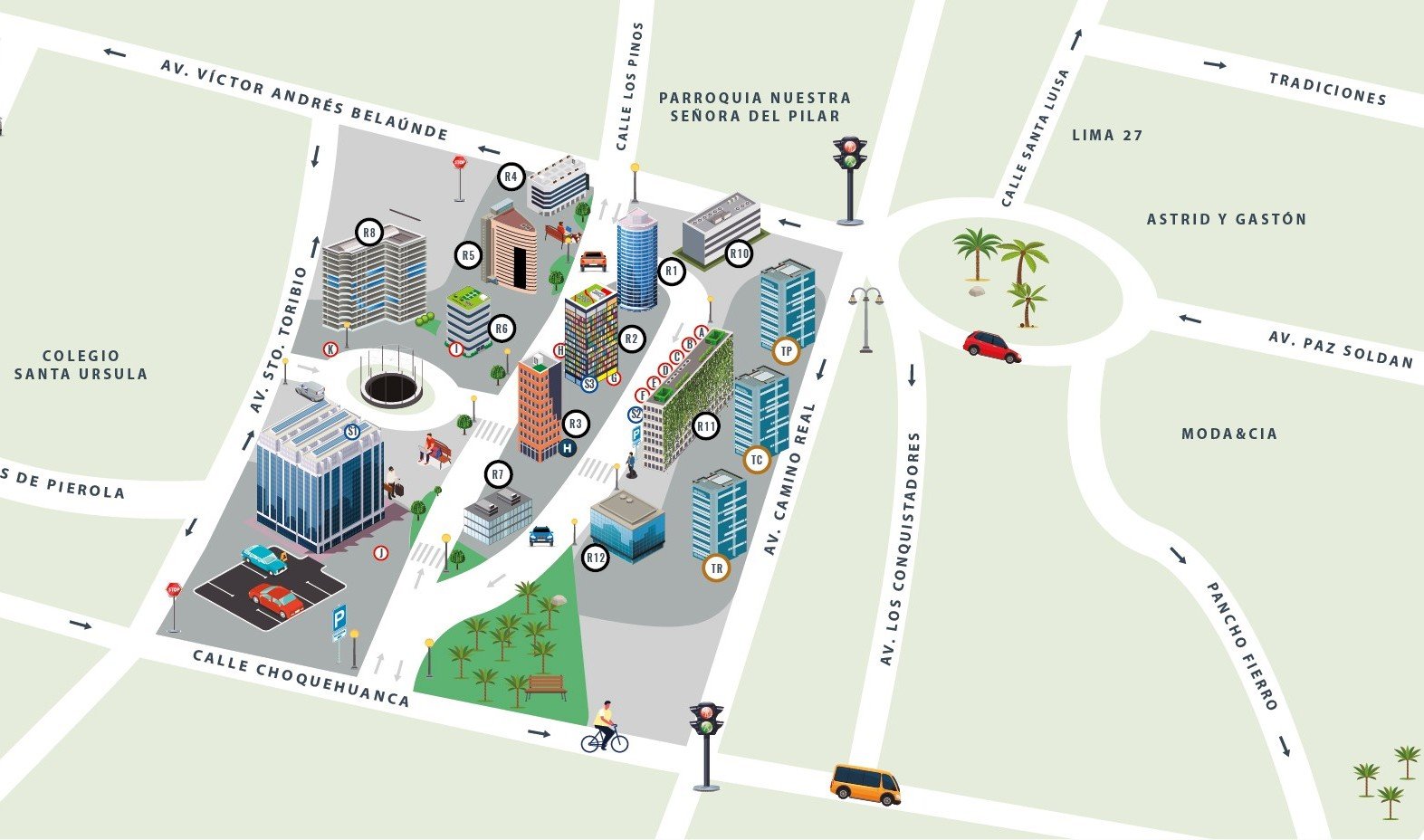 Cuenta con 12 edificios y 3 torres e ingresos desde las Av. Víctor Andrés Belaúnde, Santo Toribio, Camino Real y Ca. Choquehuanca.